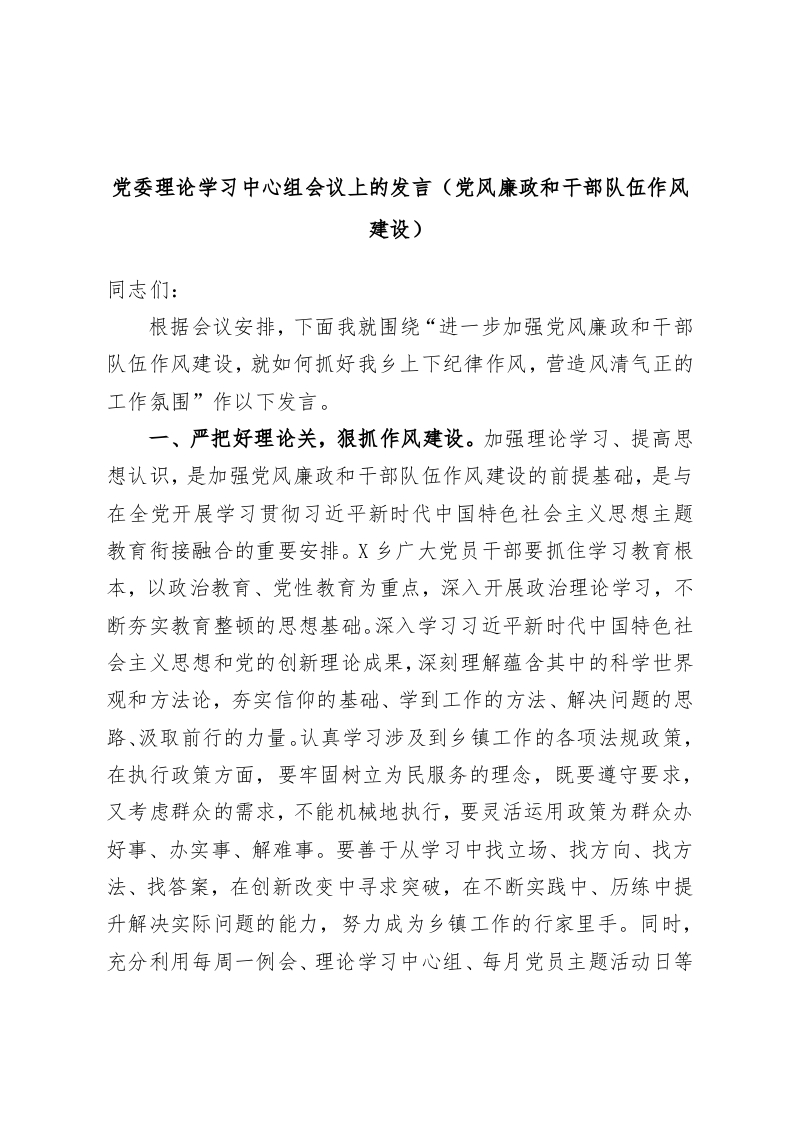 / 党委理论学习中心组会议上的发言(党风廉政和干部队伍作风建设)