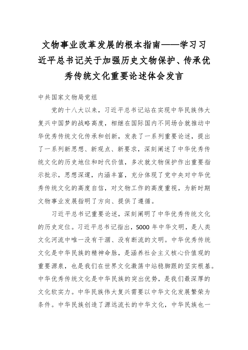 / 文物事业改革发展的根本指南——学习习近平总书记关于加强历史文物保护、传承优秀传统文化重要论述体会发言