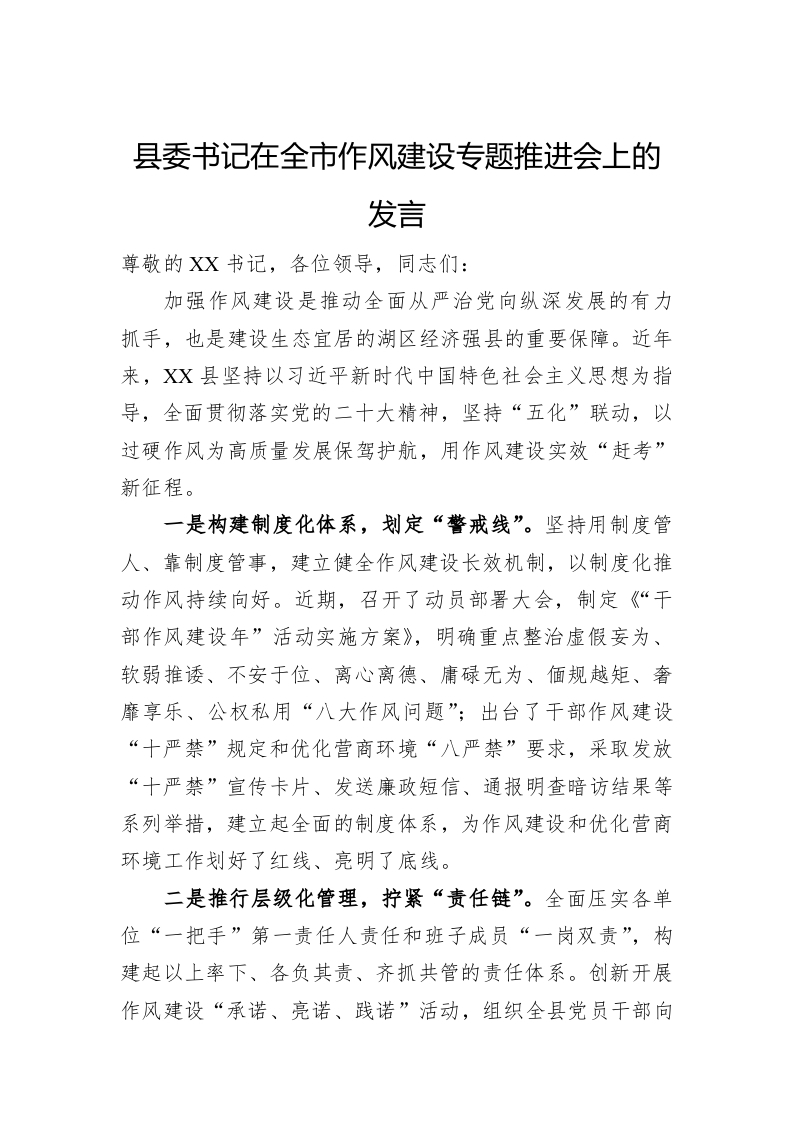 / 县委书记在全市作风建设专题推进会上的发言