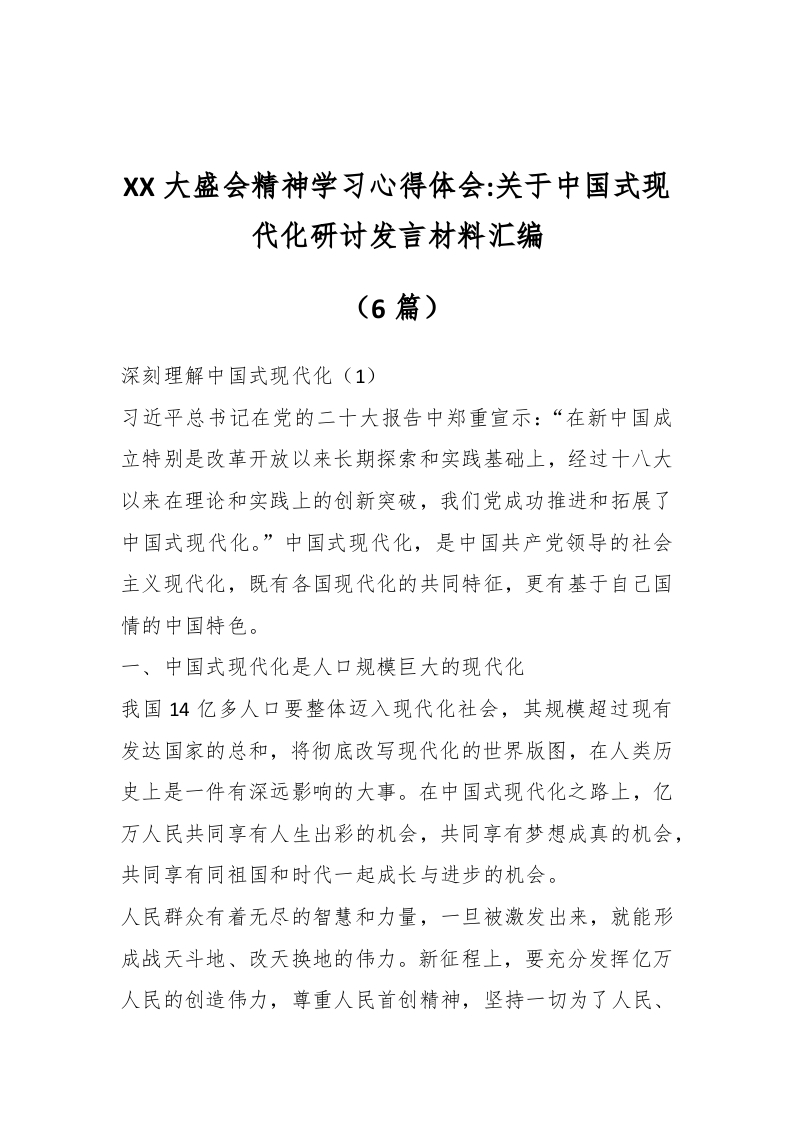 (6篇)XX大盛会精神学习心得体会关于中国式现代化研讨发言材料汇编