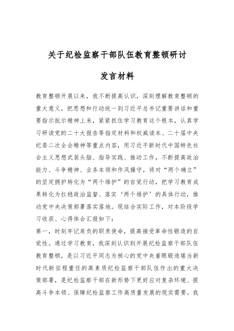 / 关于纪检监察干部队伍教育整顿研讨发言材料