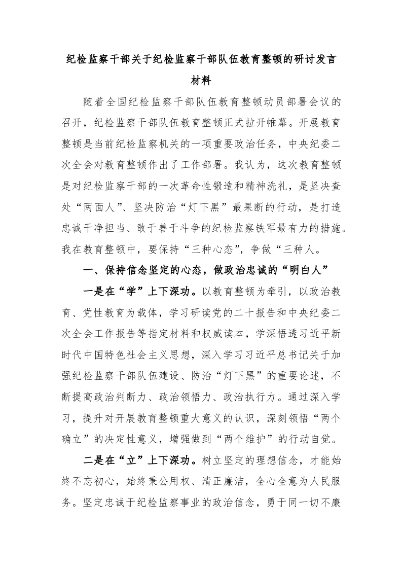 / 纪检监察干部关于纪检监察干部队伍教育整顿的研讨发言材料(二)