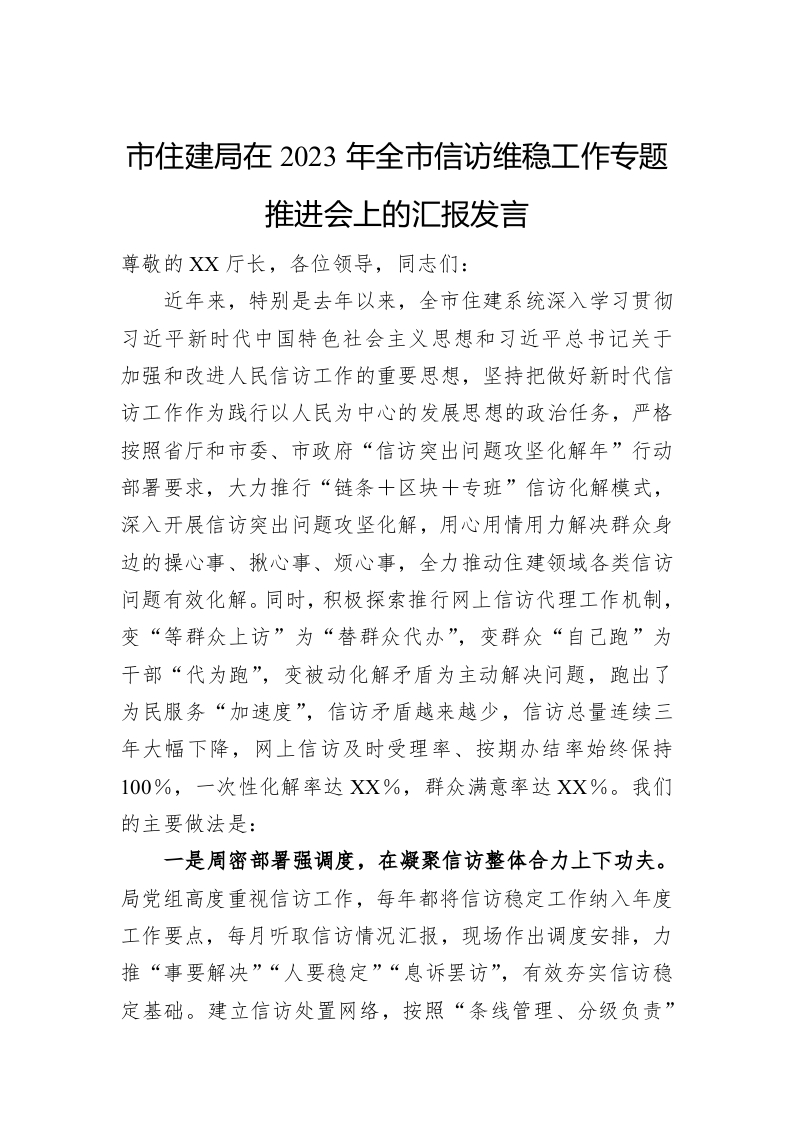 / 市住建局在2023年全市信访维稳工作专题推进会上的汇报发言