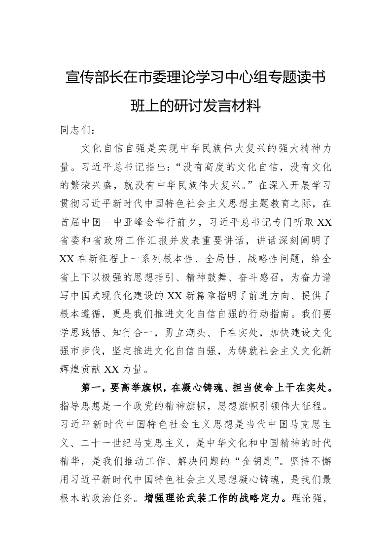 宣传部长在市委理论学习中心组专题读书班上(文化自信自强)的研讨发言材料