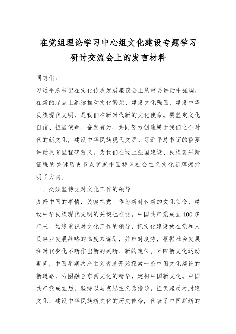 / 在党组理论学习中心组文化建设专题学习研讨交流会上的发言材料