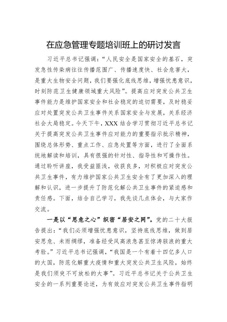 / 在应急管理专题培训班上的研讨发言