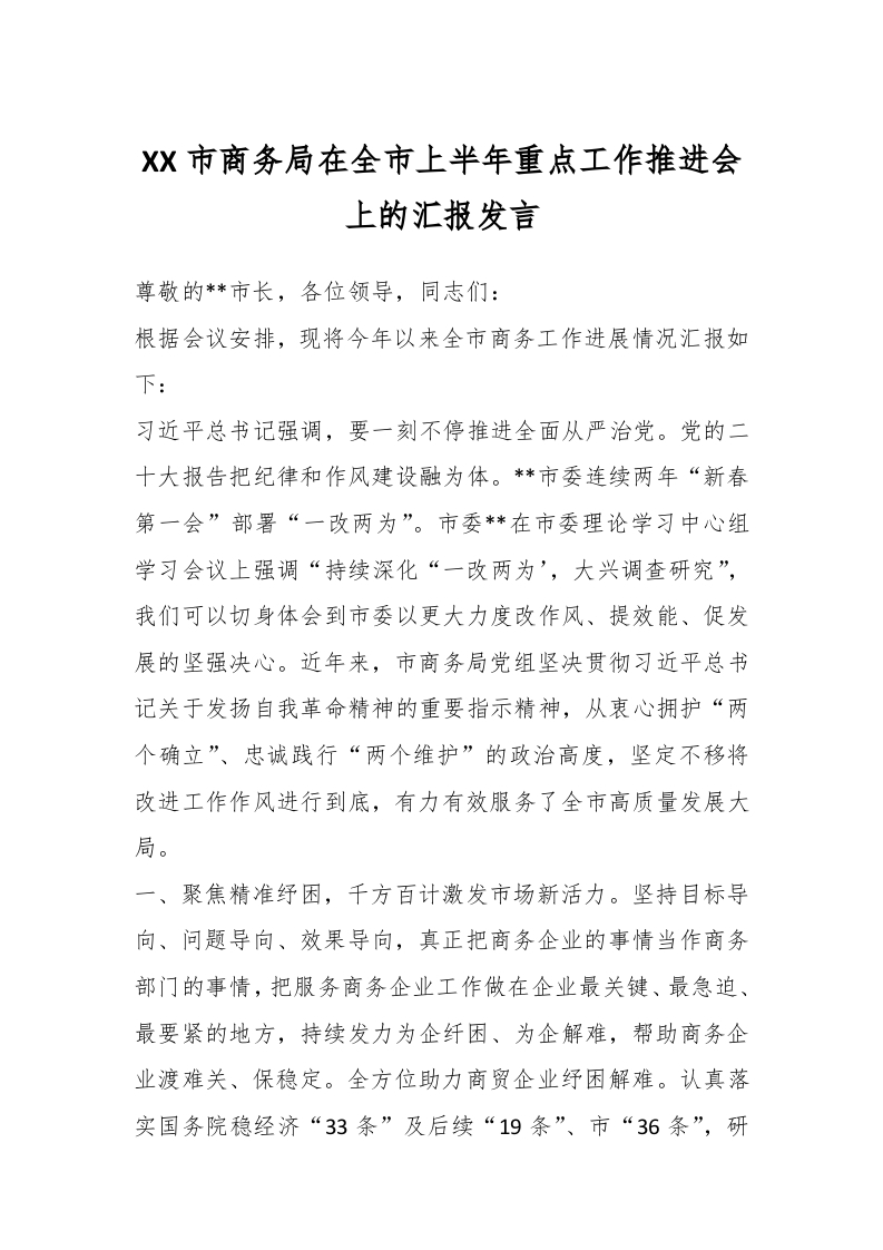 / XX市商务局在全市上半年重点工作推进会上的汇报发言