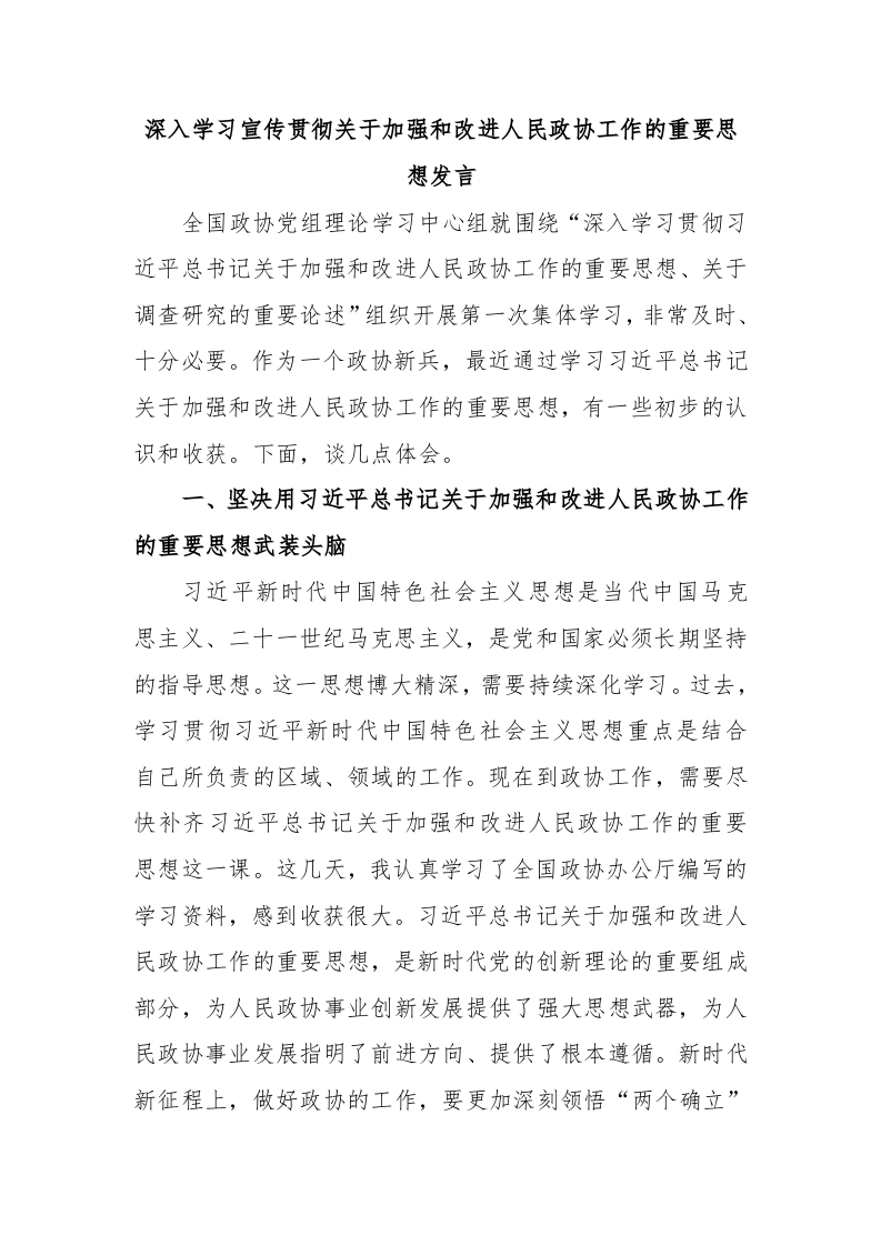 / 深入学习宣传贯彻关于加强和改进人民政协工作的重要思想发言