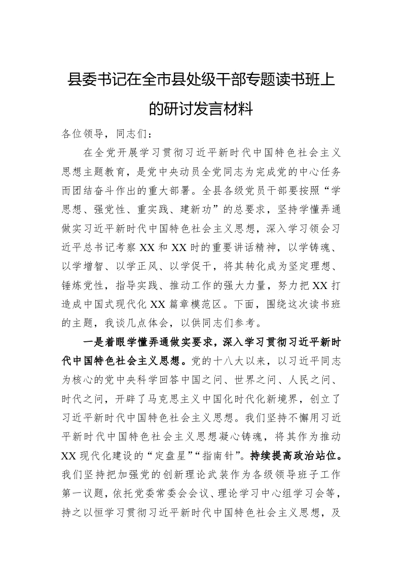 / 县委书记在全市县处级干部专题读书班上的研讨发言材料