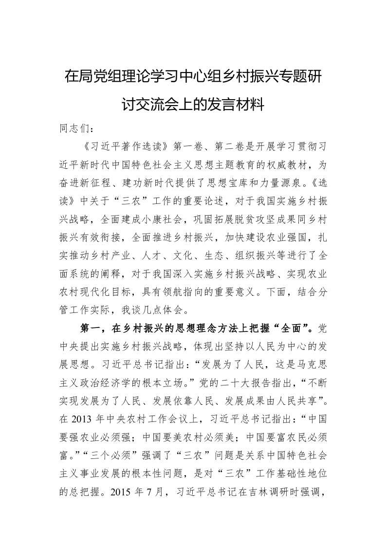 / 在局党组理论学习中心组乡村振兴专题研讨交流会上的发言材料