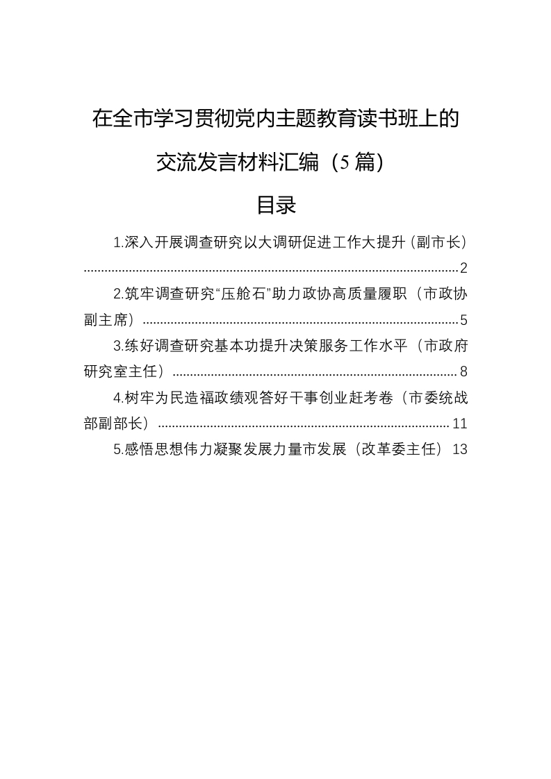 / 在全市学习贯彻党内主题教育读书班上的交流发言材料汇编(5篇)(二)