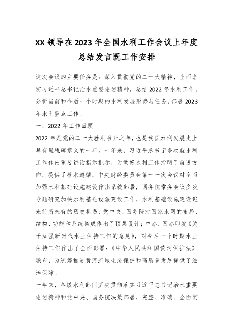 / XX领导在2023年全国水利工作会议上年度总结发言既工作安排