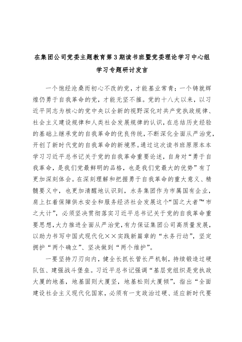 / 在集团公司党委主题教育第3期读书班暨党委理论学习中心组学习专题研讨发言
