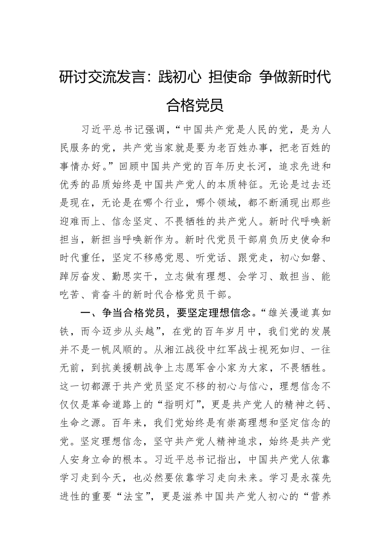 / 研讨交流发言:践初心+担使命+争做新时代合格党员