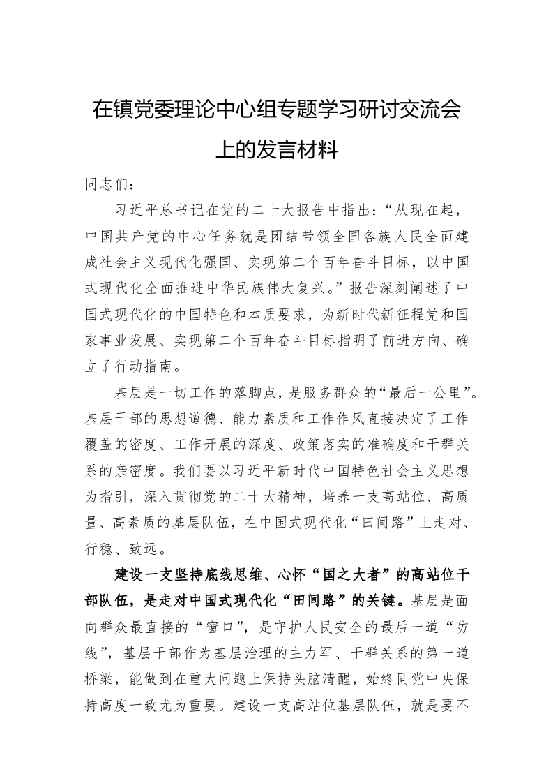 / 在镇党委理论中心组专题学习研讨交流会上的发言材料