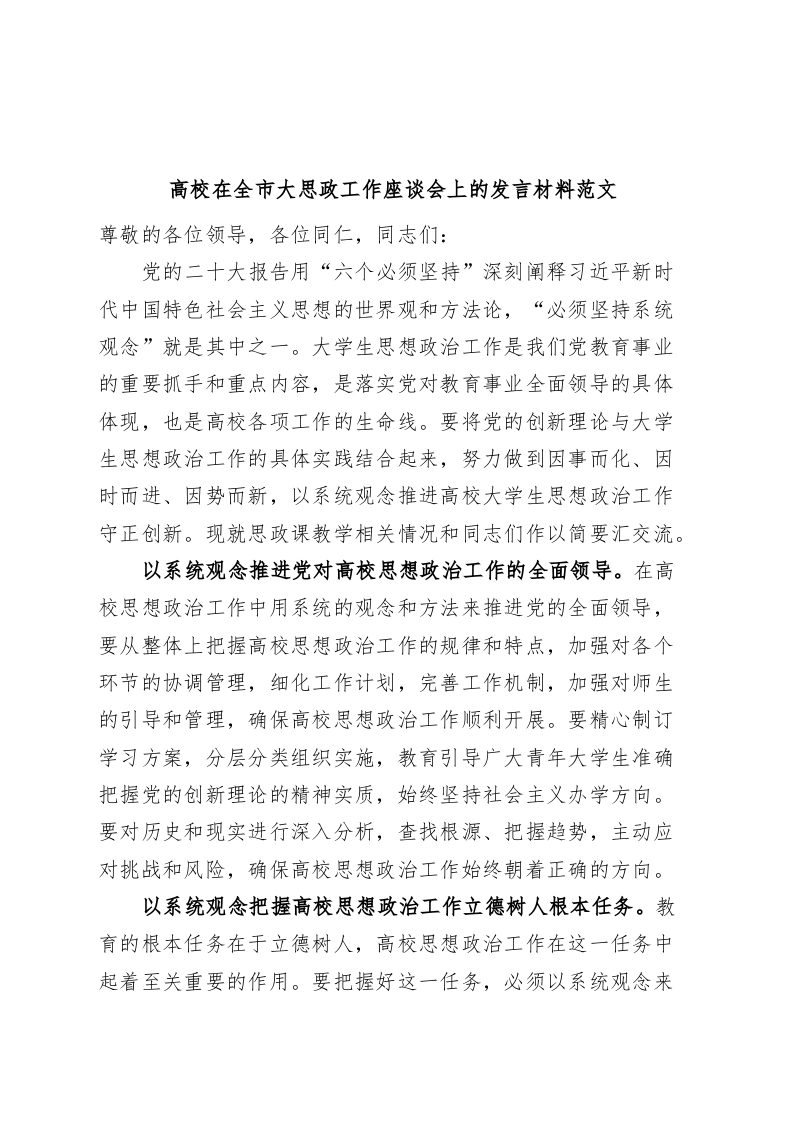 / 高校在全市大思政工作座谈会上的发言材料大学生思想政治研讨