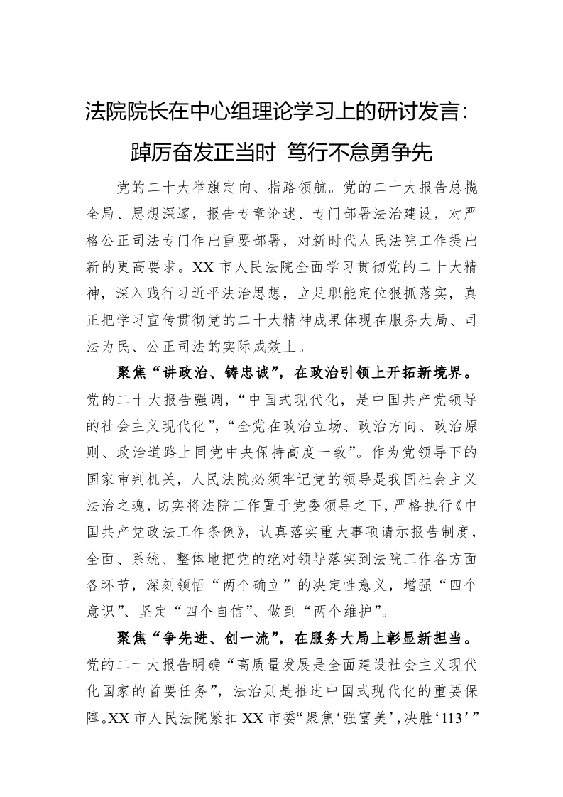 / 法院院长在中心组理论学习上的研讨发言:踔厉奋发正当时+笃行不怠勇争先