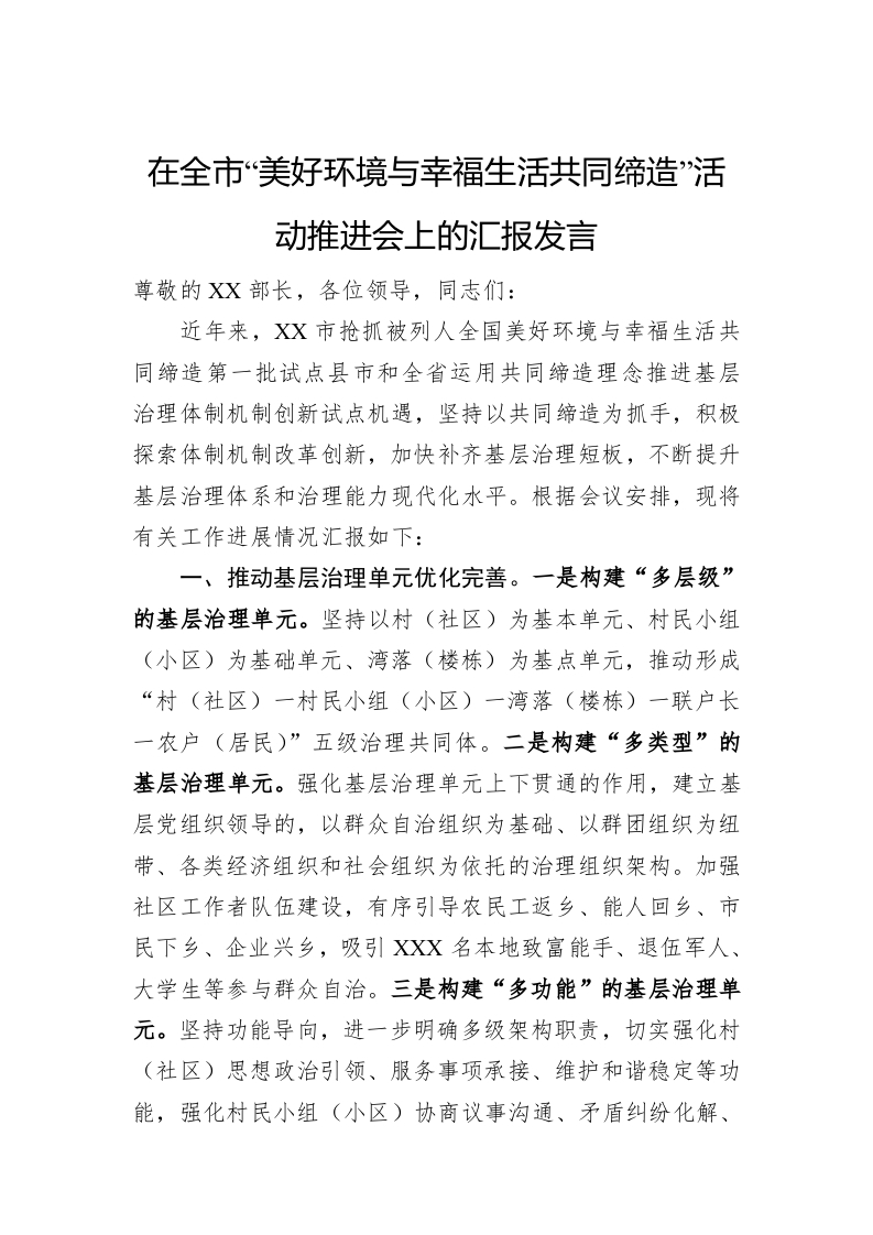 / 在全市“美好环境与幸福生活共同缔造”活动推进会上的汇报发言