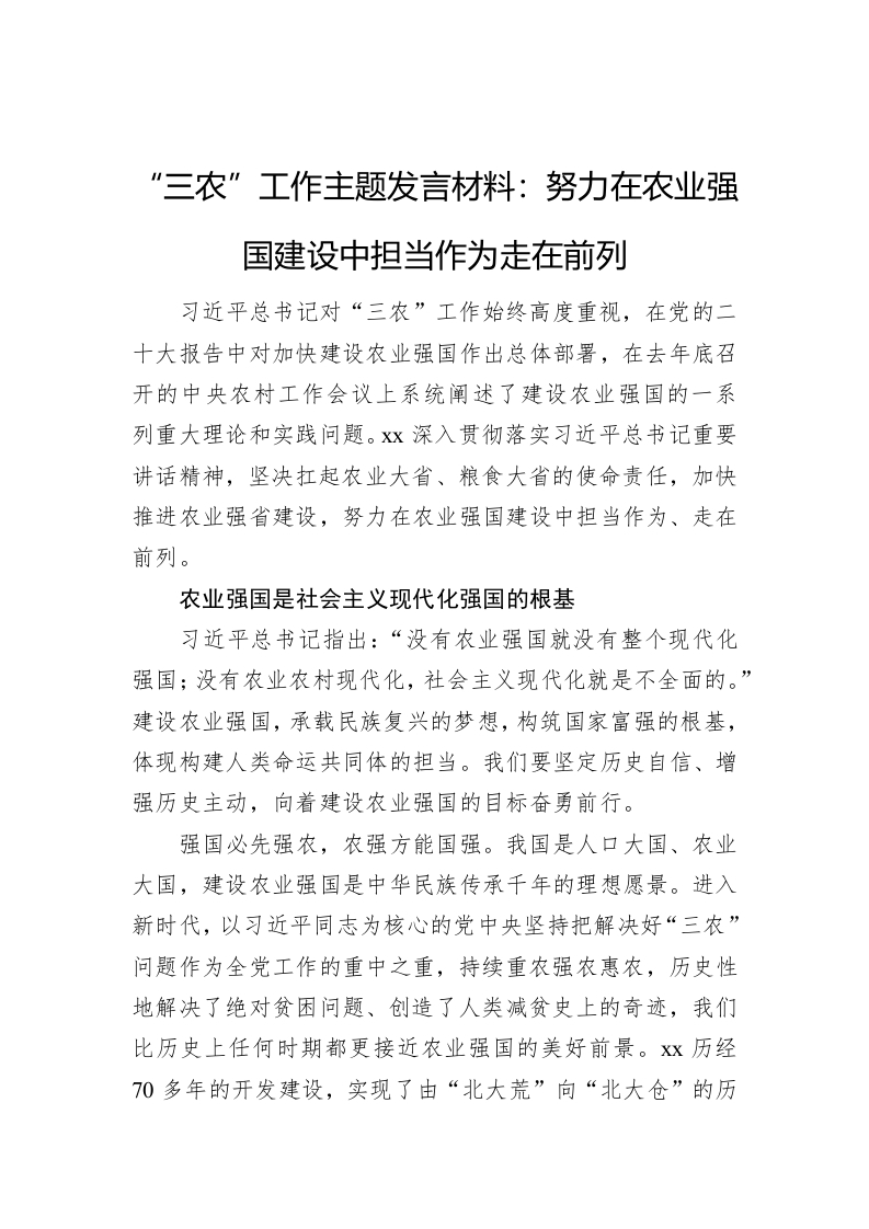 / “三农”工作主题发言材料:努力在农业强国建设中担当作为走在前列