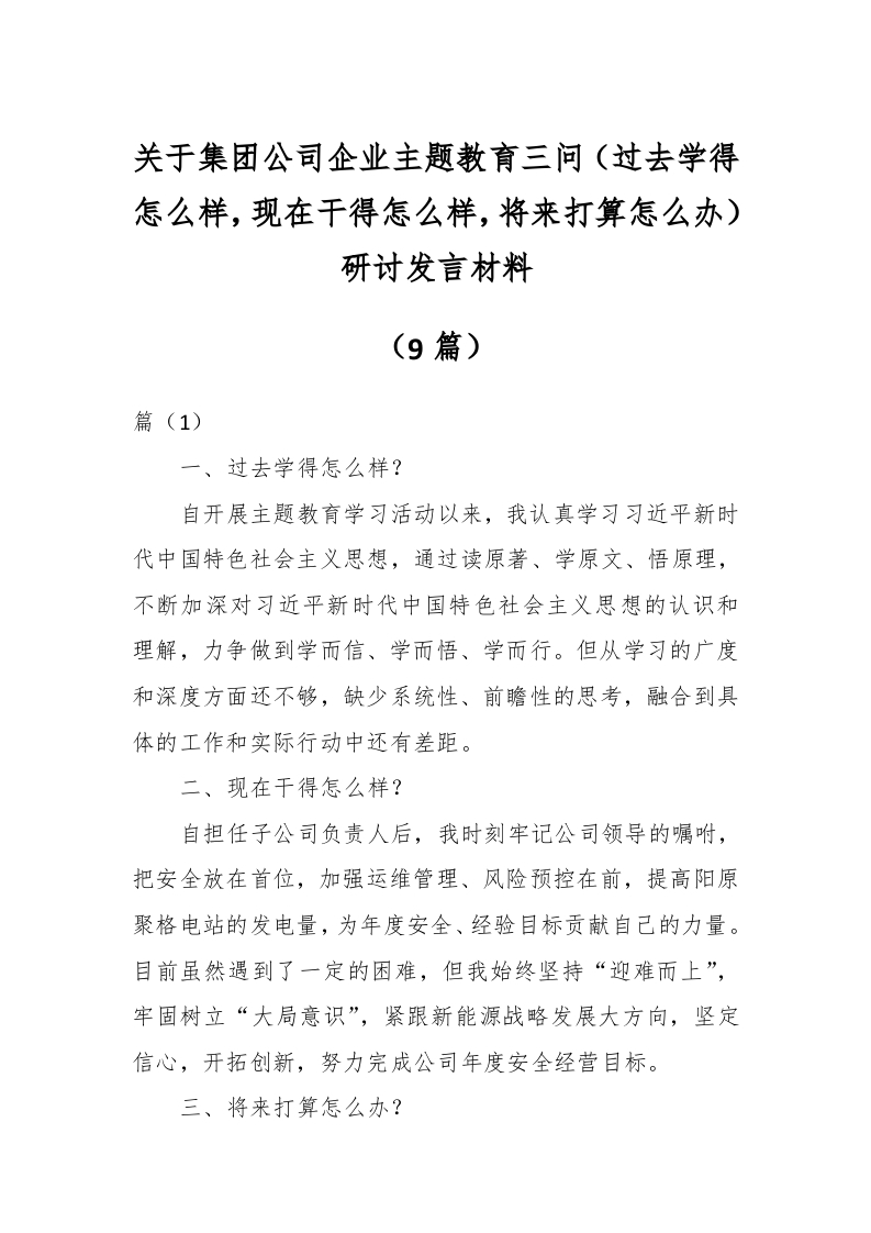 (9篇)关于集团公司企业主题教育三问(过去学得怎么样,现在干得怎么样,将来打算怎么办)研讨发言材料