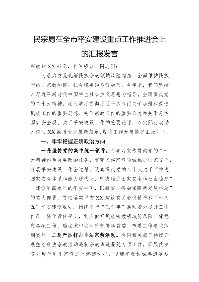/ 民宗局在全市平安建设重点工作推进会上的汇报发言