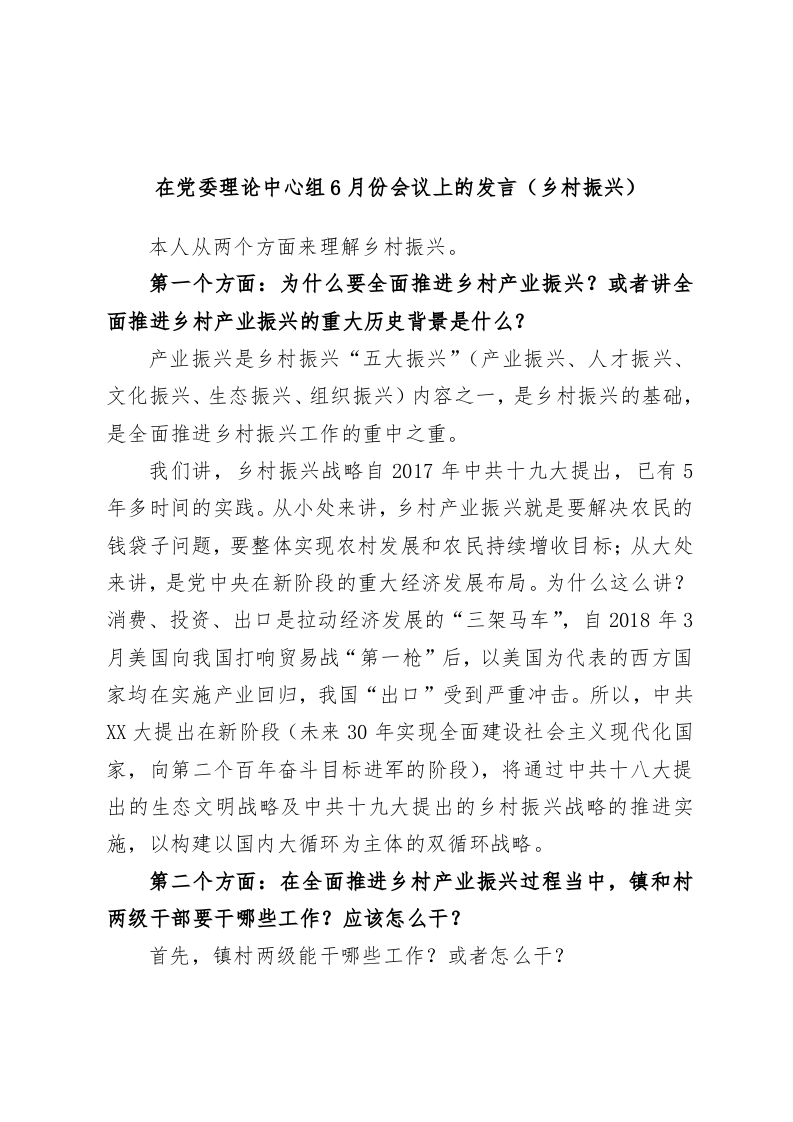 / 在党委理论中心组6月份会议上的发言(乡村振兴)