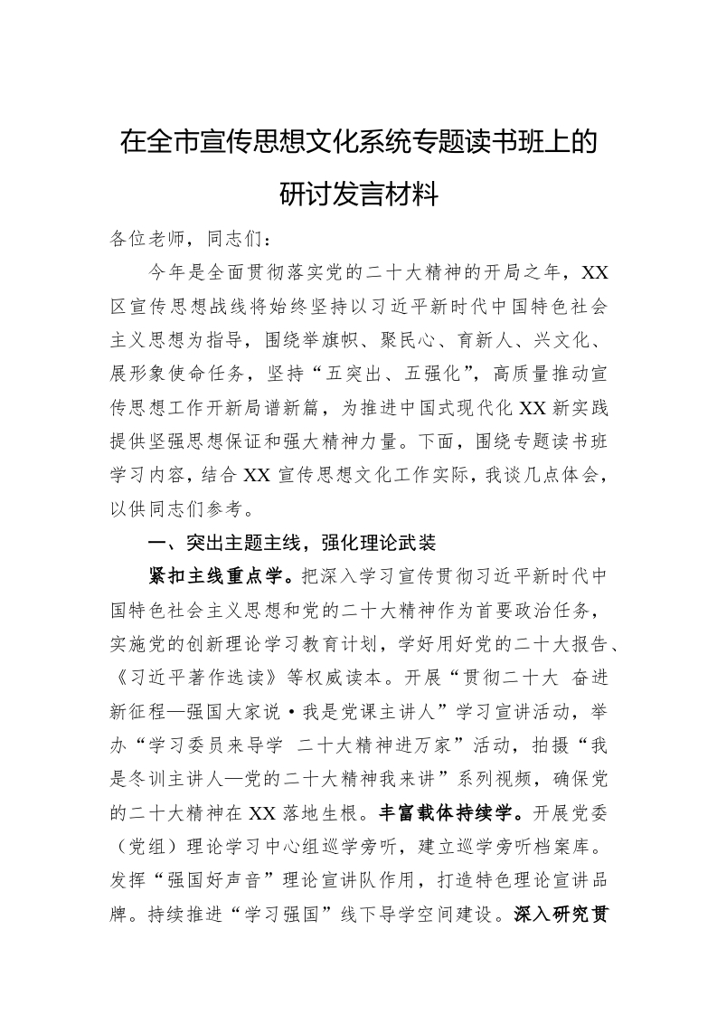 / 在全市宣传思想文化系统专题读书班上的研讨发言材料