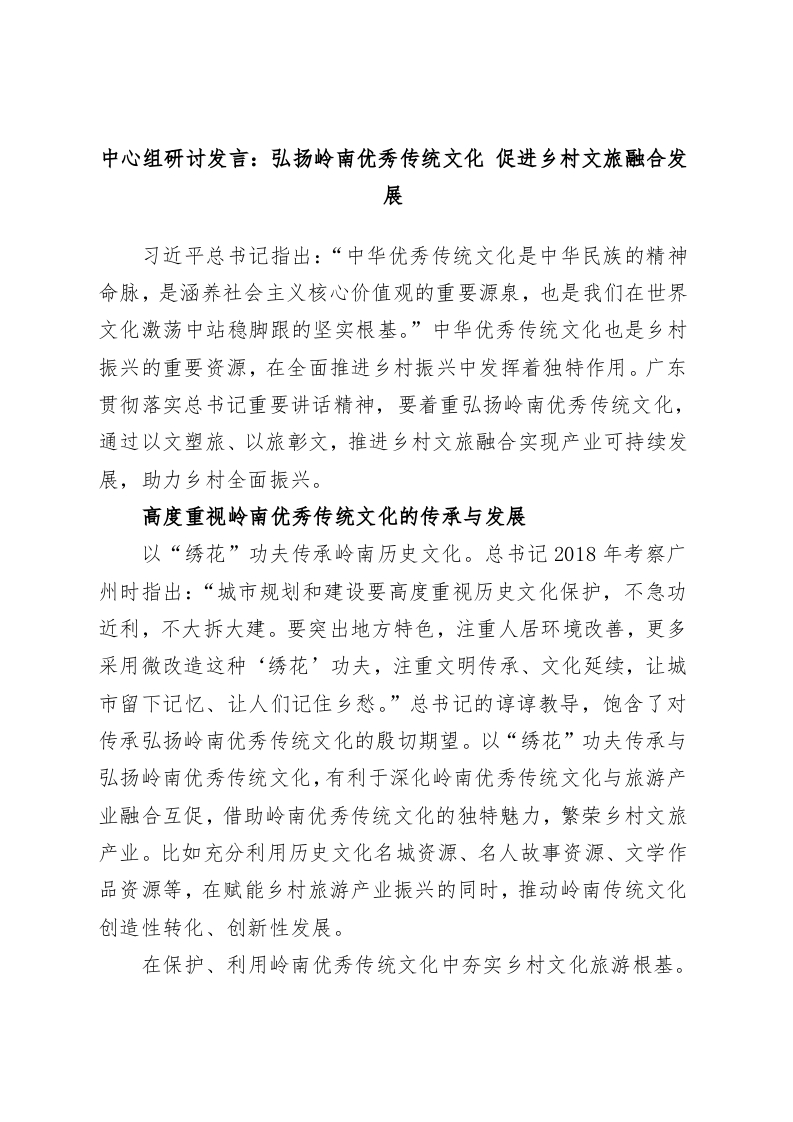 / 中心组研讨发言:弘扬岭南优秀传统文化 促进乡村文旅融合发展