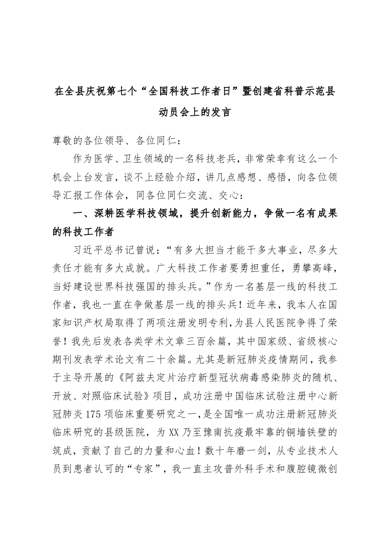 / 在全县庆祝第七个“全国科技工作者日”暨创建省科普示范县动员会上的发言