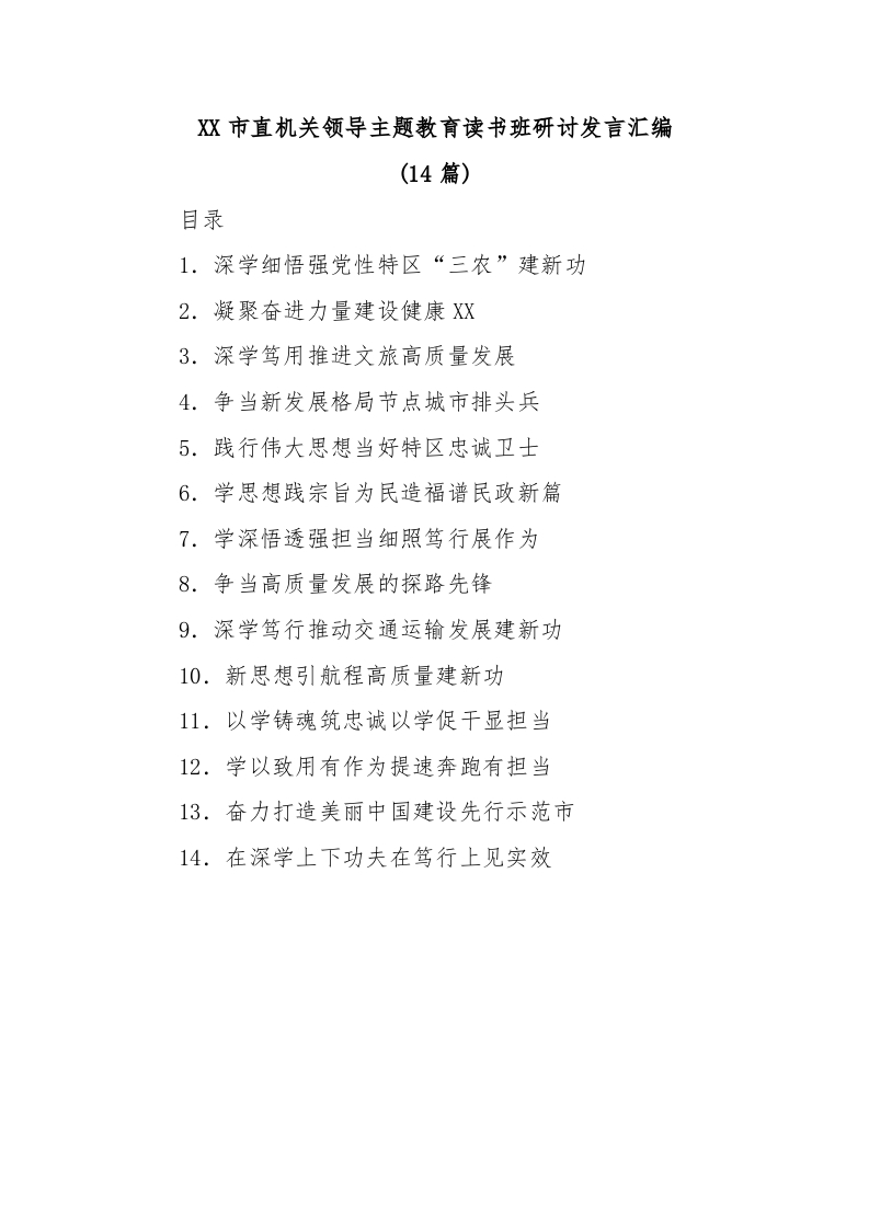 / (14篇)XX市直机关领导主题教育读书班研讨发言汇编