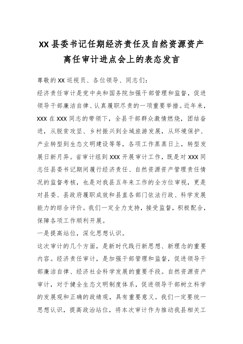 / XX县委书记任期经济责任及自然资源资产离任审计进点会上的表态发言