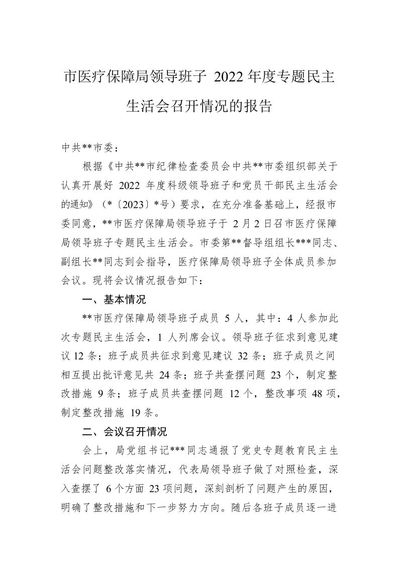 / 市医疗保障局领导班子2022年度专题民主生活会召开情况的报告