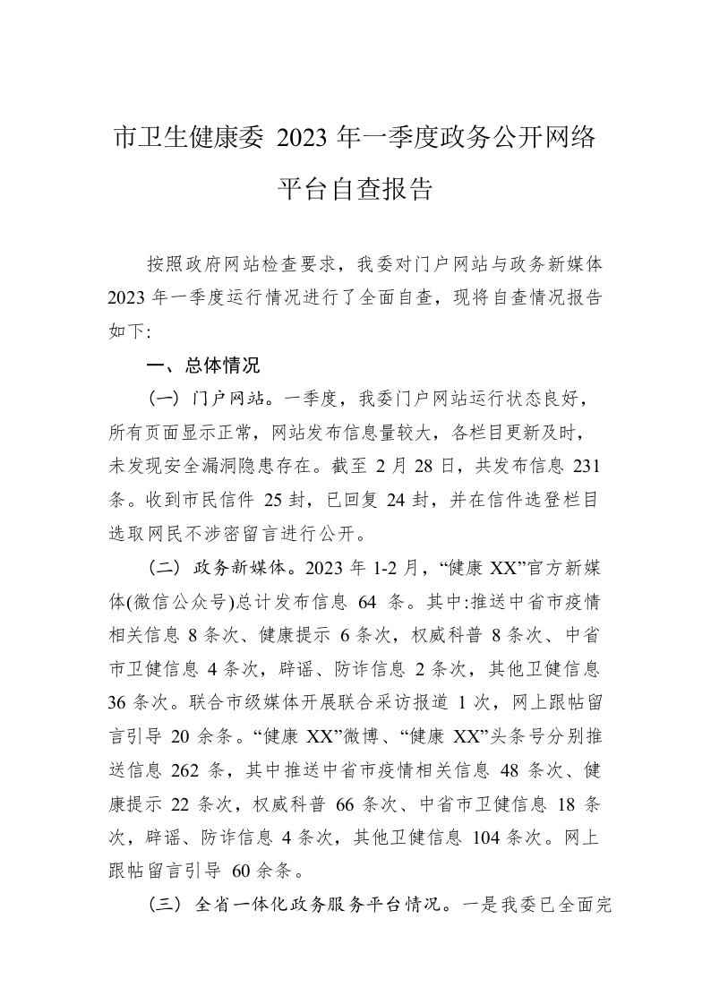 / 市卫生健康委2023年一季度政务公开网络平台自查报告(20230303)