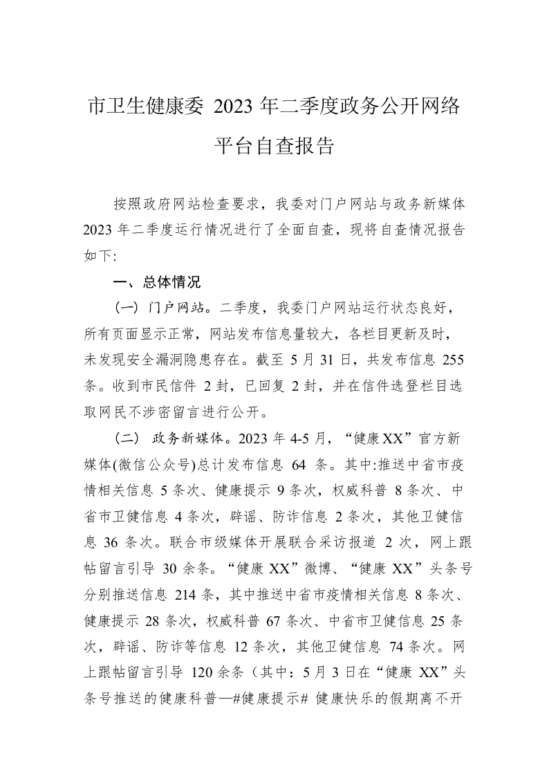 / 市卫生健康委2023年二季度政务公开网络平台自查报告(20230602)