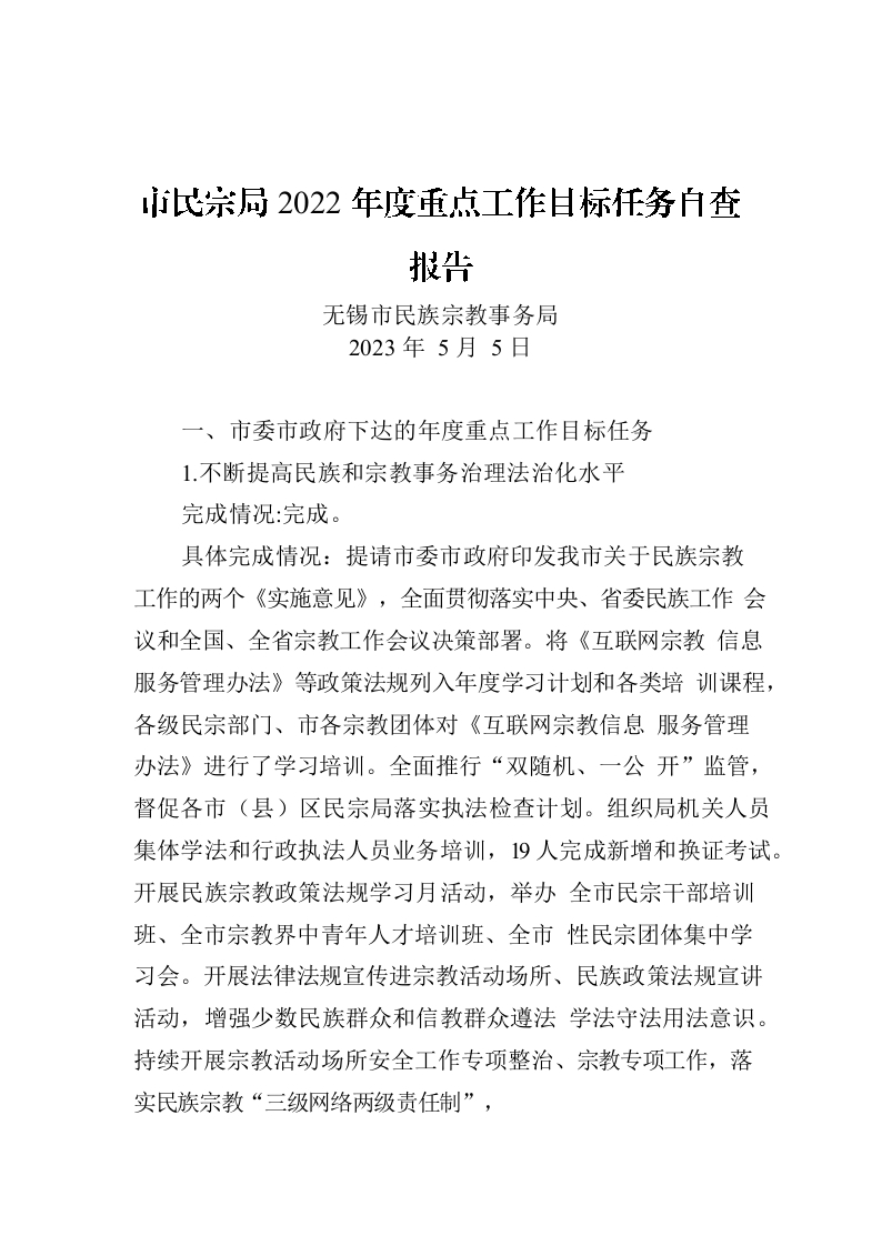 / 市民宗局2022年度重点工作目标任务自查报告