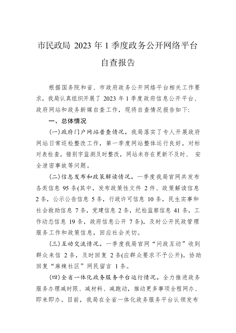 / 市民政局2023年1季度政务公开网络平台自查报告(20230308)