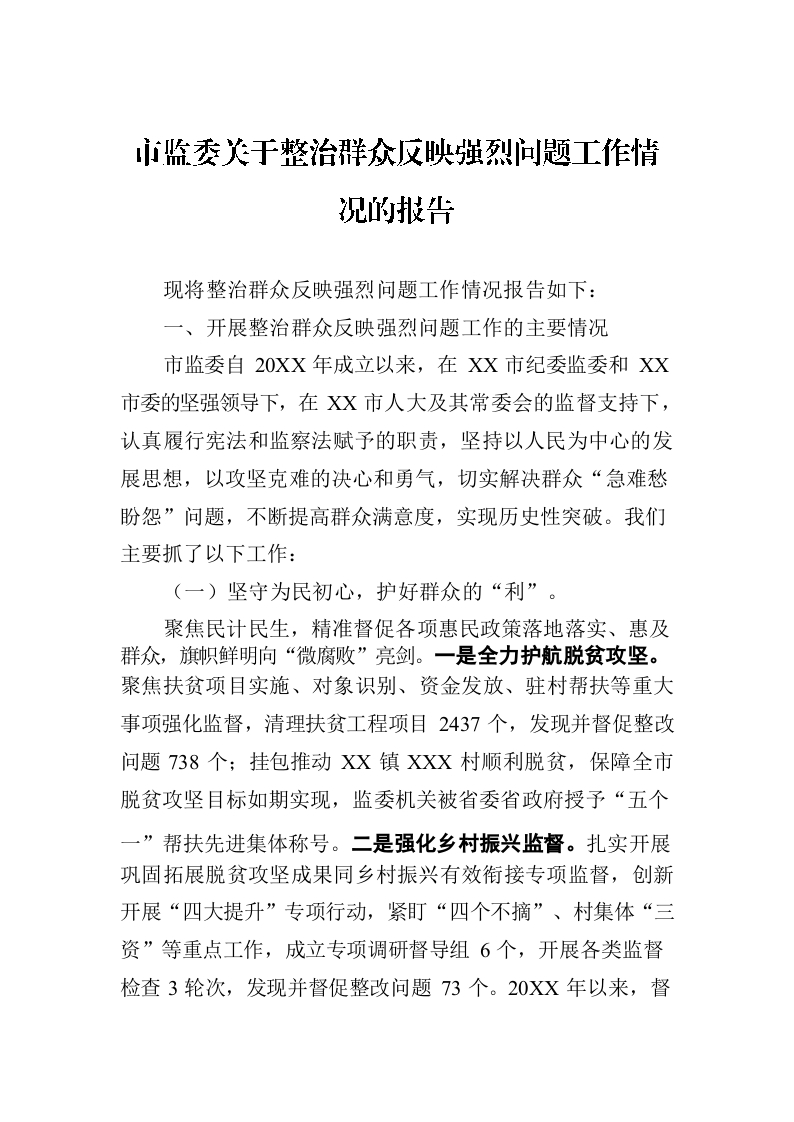 / 市监委关于整治群众反映强烈问题工作情况的报告