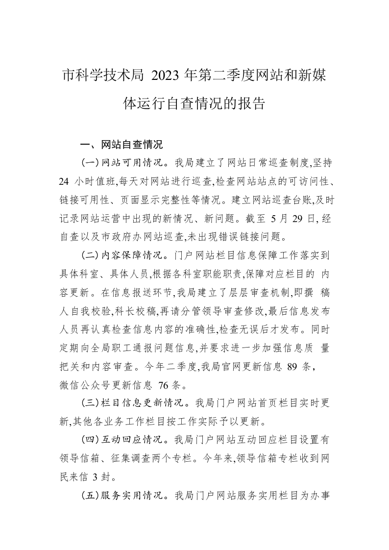 / 市科学技术局2023年第二季度网站和新媒体运行自查情况的报告(20230529)