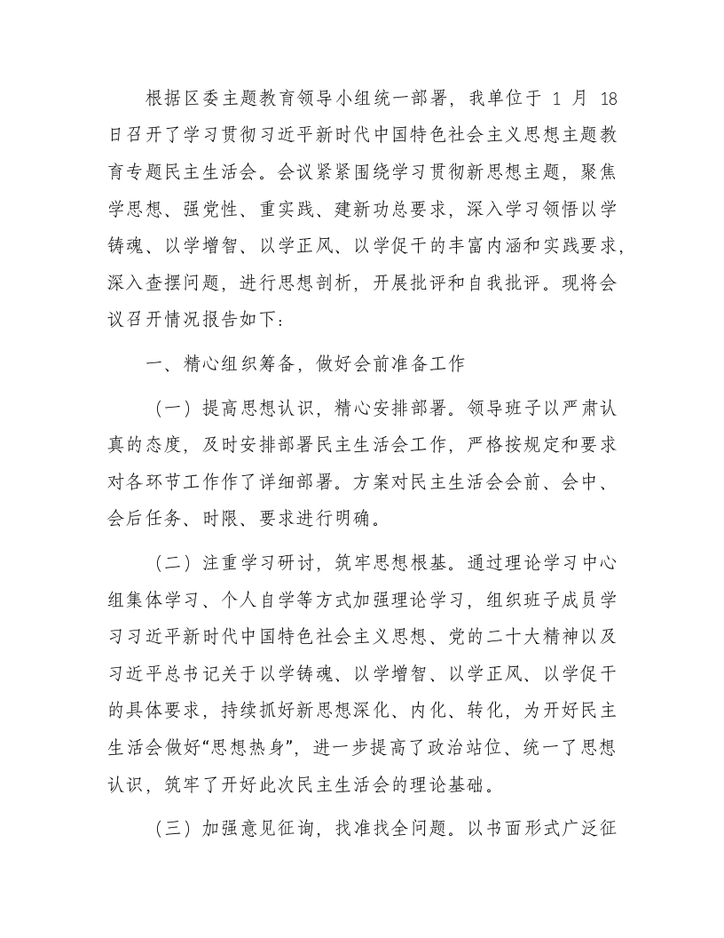 / (会后)主题教育专题民主生活会召开情况报告