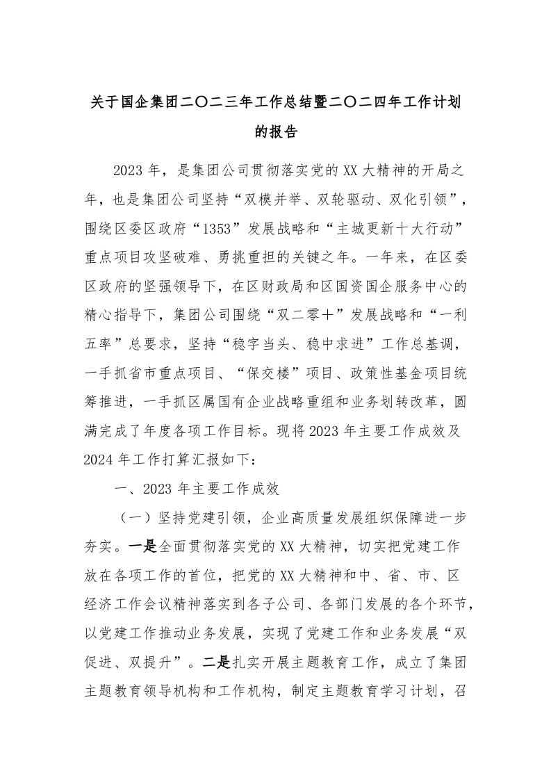 / 关于国企集团2023年工作总结暨2024年工作计划的报告