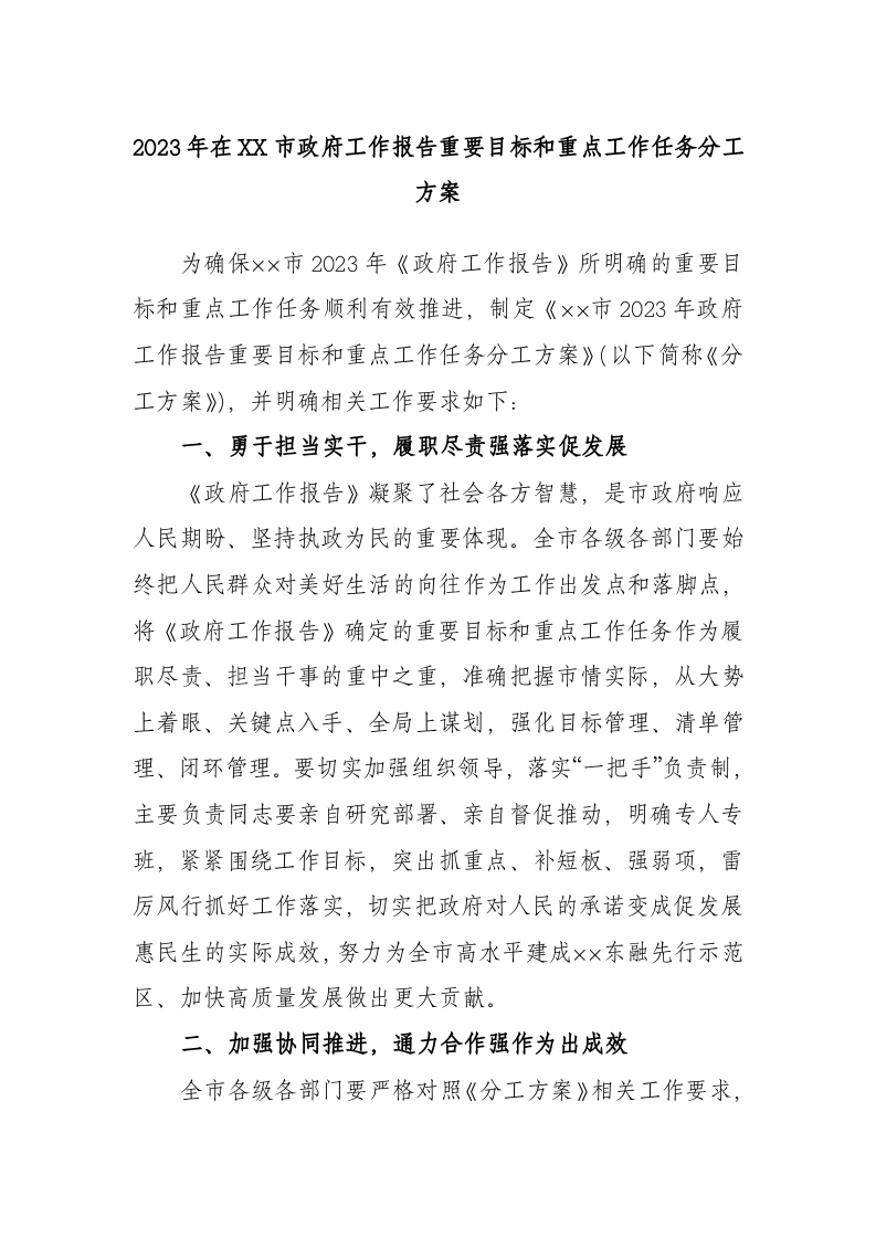 / 2023年在市政府工作报告重要目标和重点工作任务分工方案