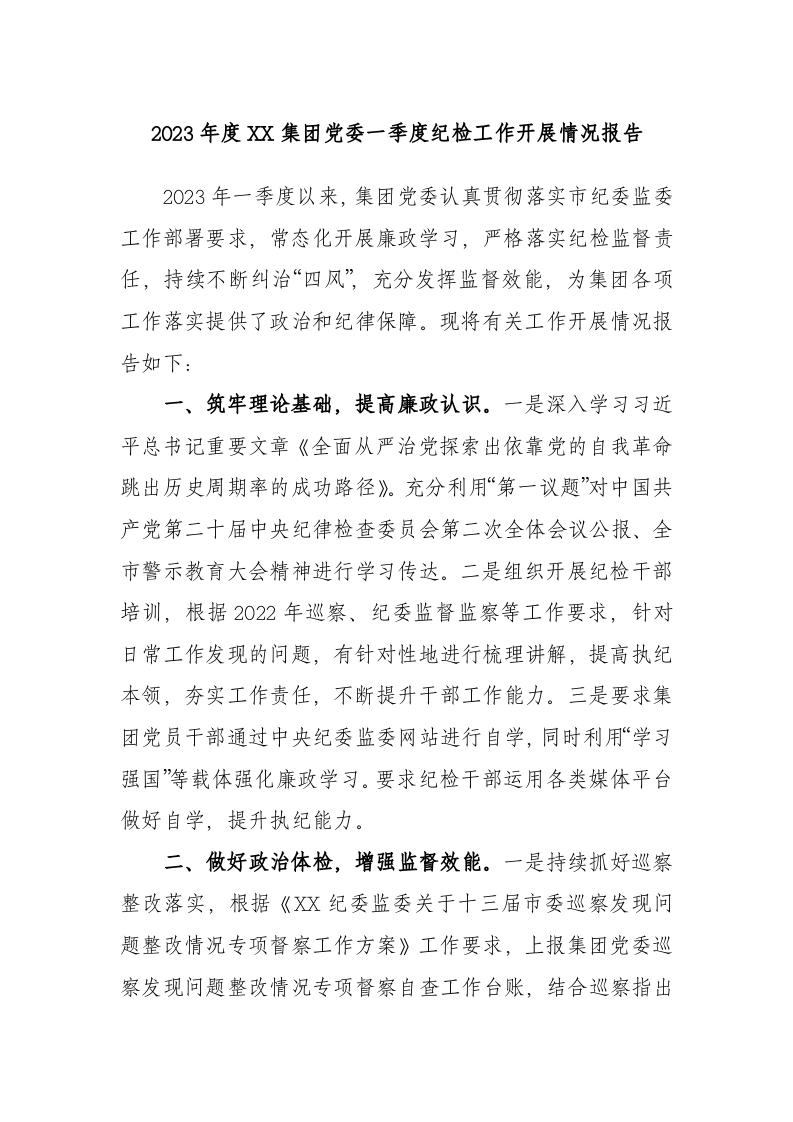 2023年度集团党委一季度纪检工作开展情况报告