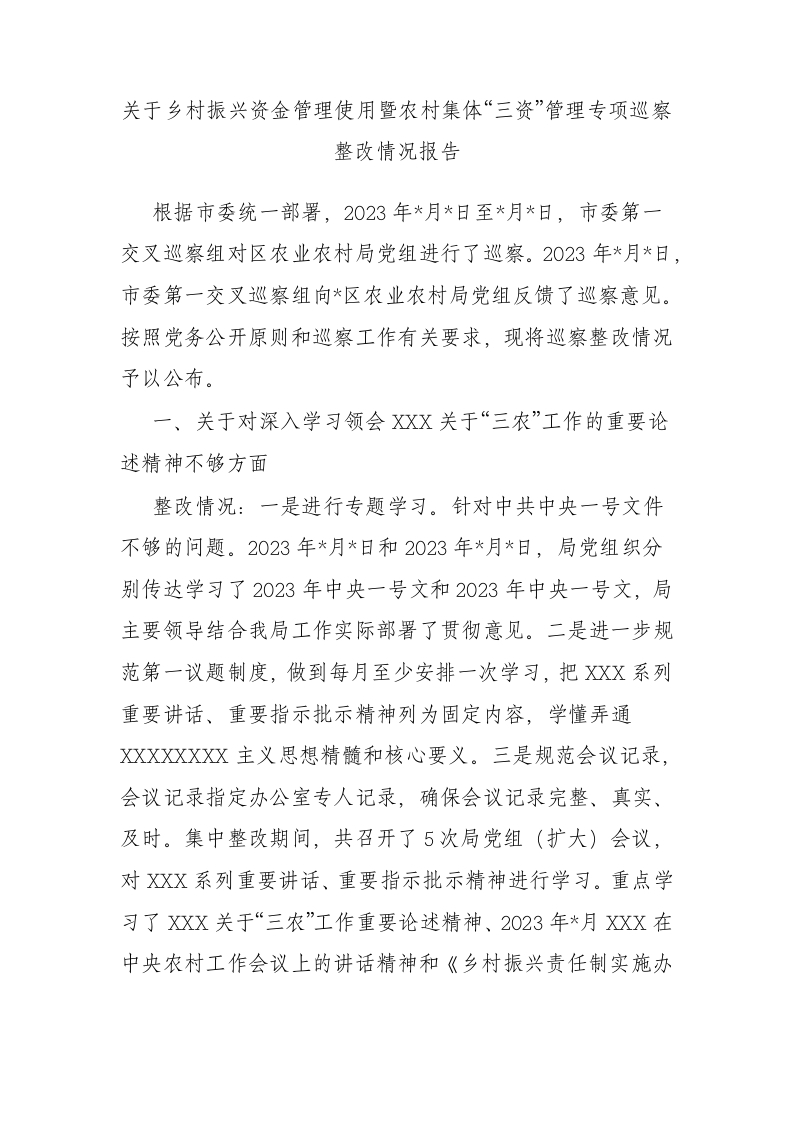 / 乡村振兴资金管理使用暨农村集体“三资”管理专项巡察整改情况报告
