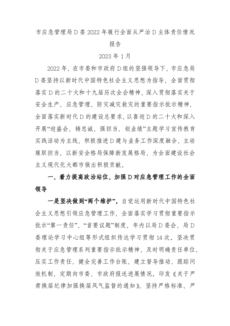 / 市应急管理局党委XX年履行全面从严治党主体责任情况报告