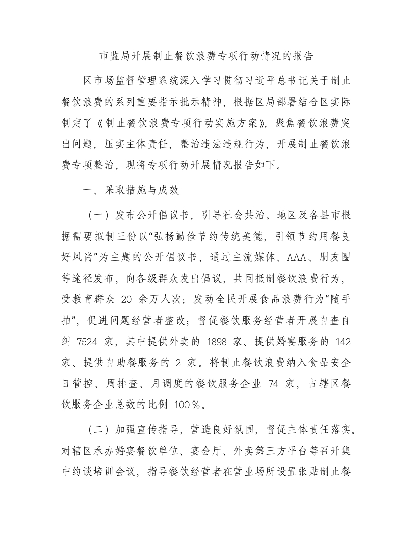 / 开展制止餐饮浪费专项行动情况报告(市场监管)