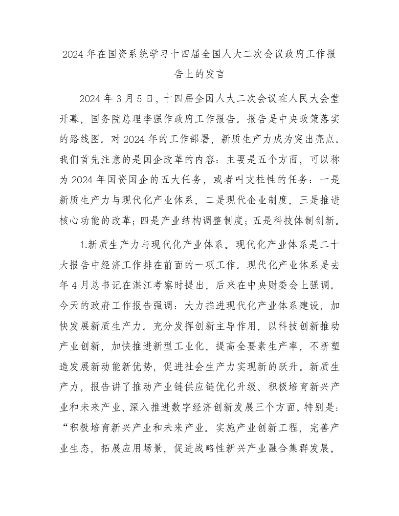 / 2024年在国资系统学习十四届全国人大二次会议政府工作报告上的发言