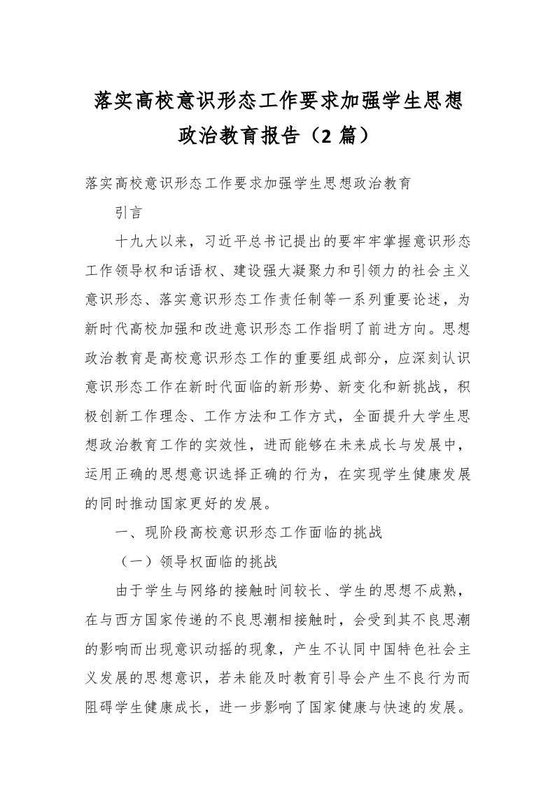 (2篇)落实高校意识形态工作要求加强学生思想政治教育报告