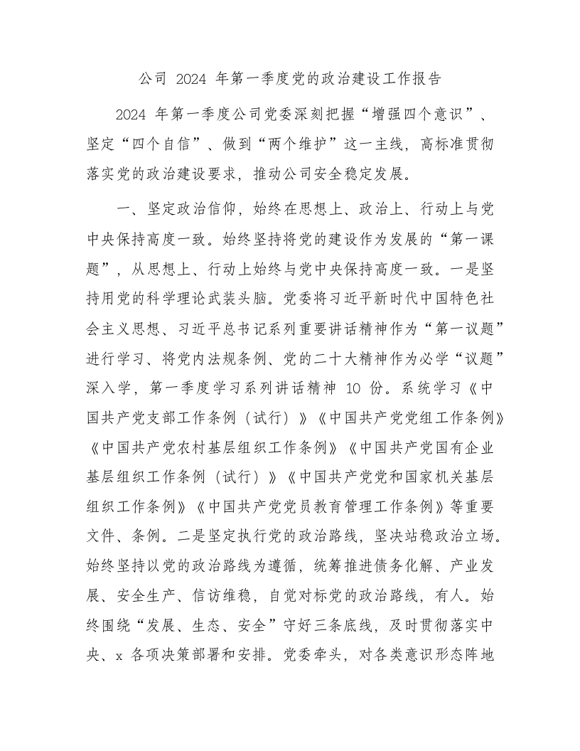 / 国企2024年第一季度党的政治建设工作报告2300字