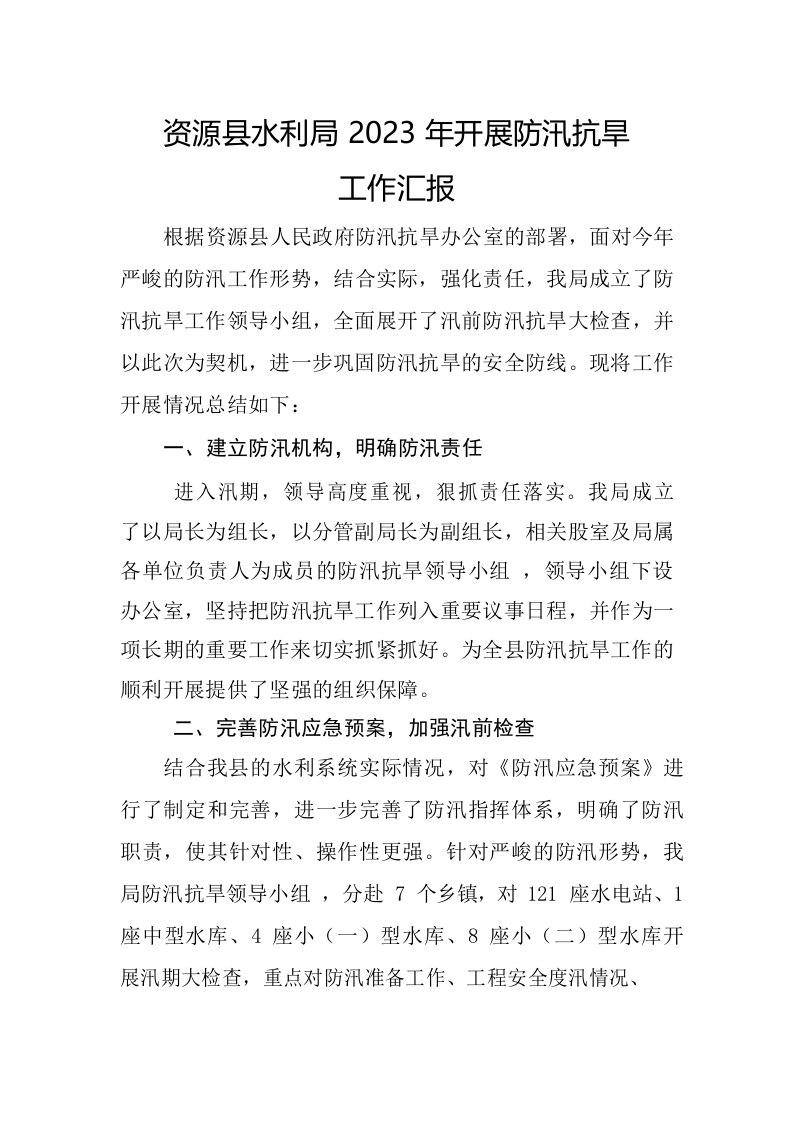 / XX县水利局2023年开展防汛抗旱工作汇报