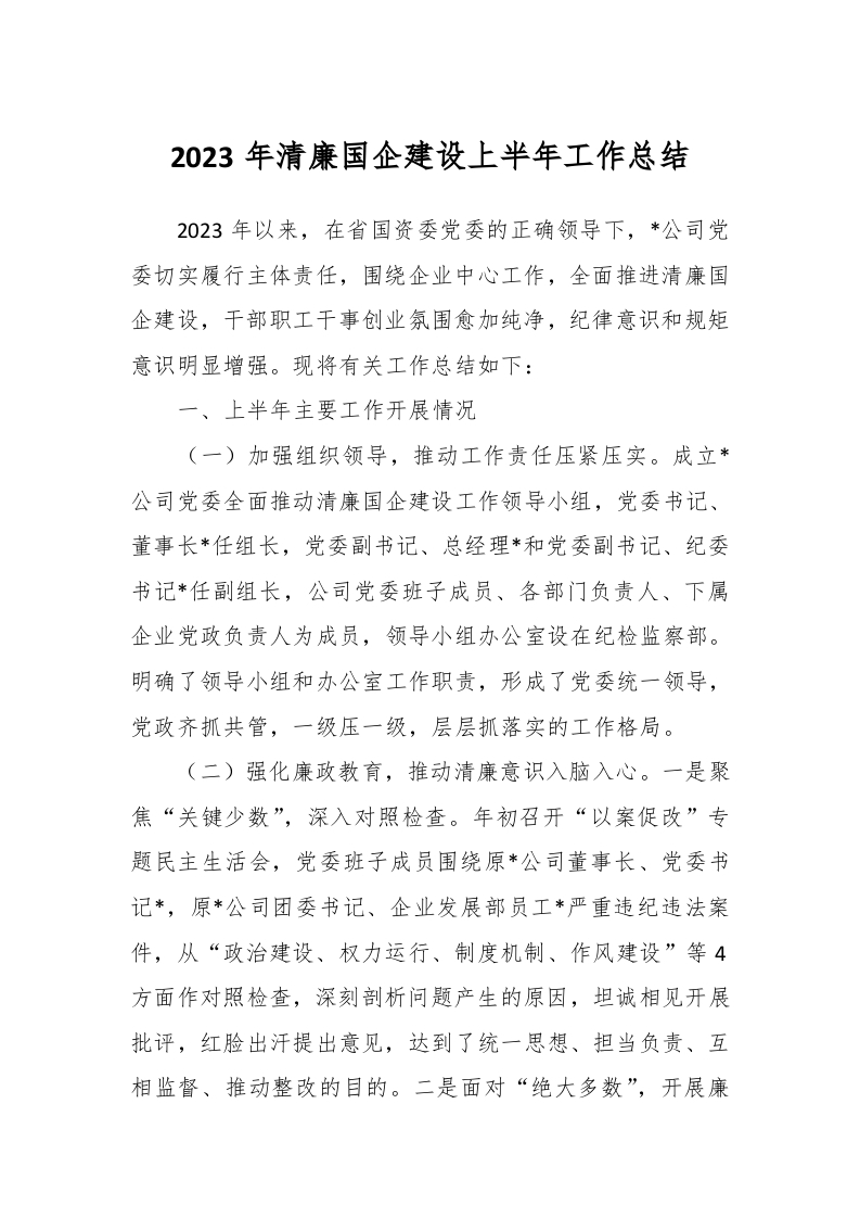 / 2023年清廉国企建设上半年工作总结